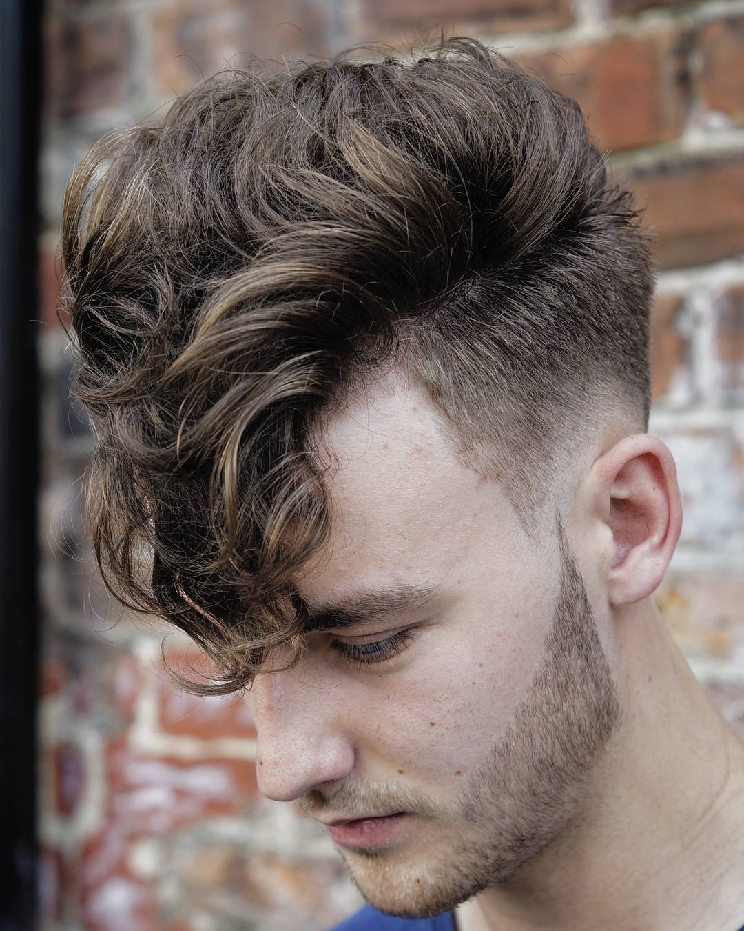 Выцветание этой кудрявой прически падает вокруг затылка, что делает ее отличным вариантом для мужчин, которые пытаются замаскировать неправильную форму головы.